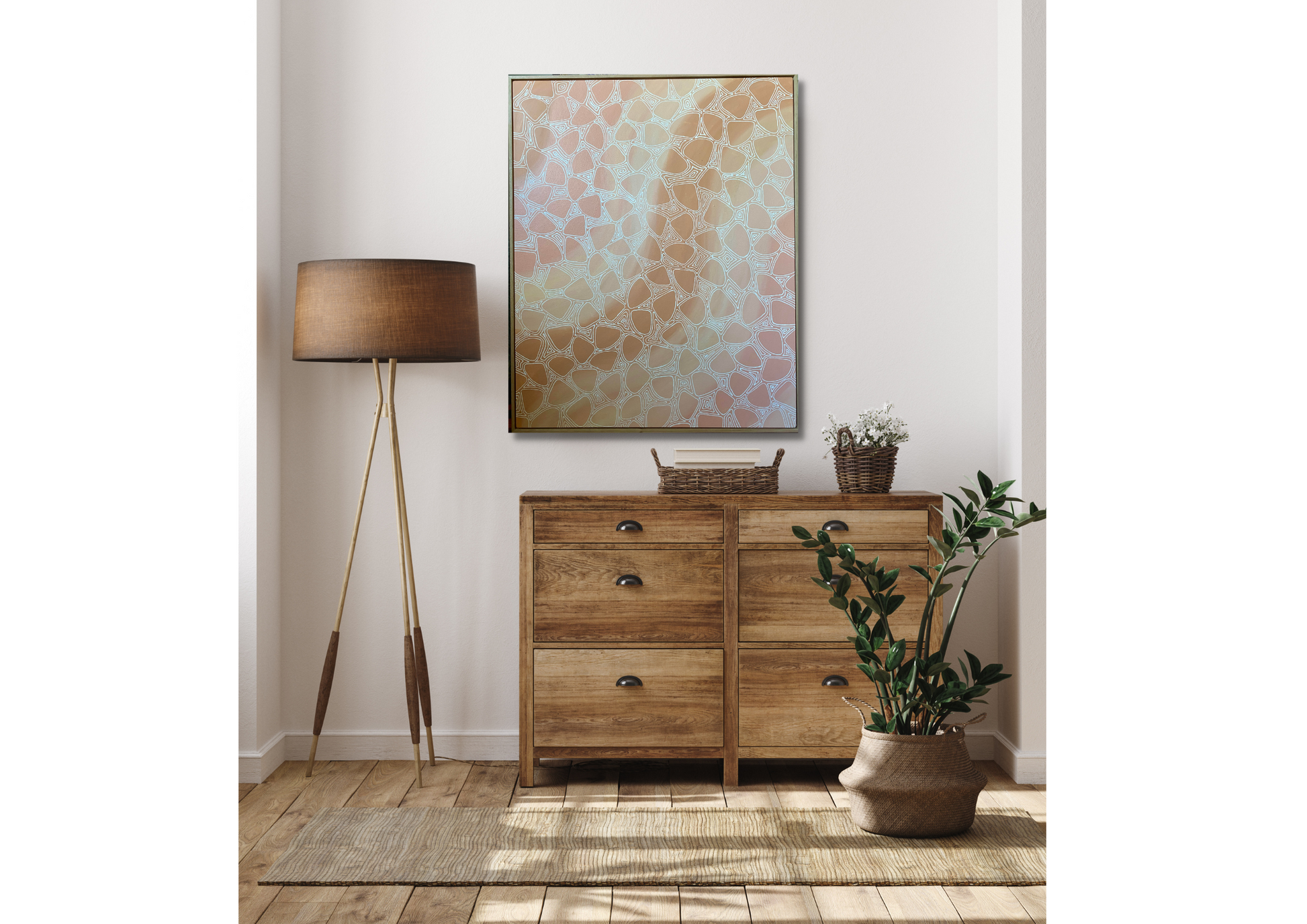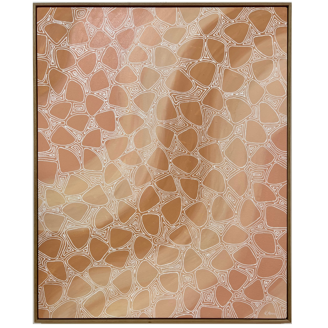 This original artwork is painted with acrylic on canvas that has been hand stretched and is framed in a Tasmanian oak timber floating frame. It includes hanging wire and wall bumpers so your artwork is ready to hang, no assembly required.